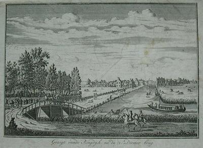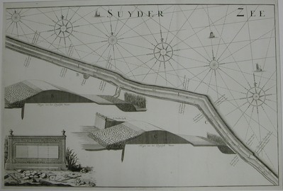 Plattegrond van vesting Muiden. Weergegeven zijn de vestingmuren en, in stippellijnen, de (hoofd)straten. Links de plattegrond van het Muiderslot. Linksboven het wapen van Muiden, rechtsboven een Duitse legenda.