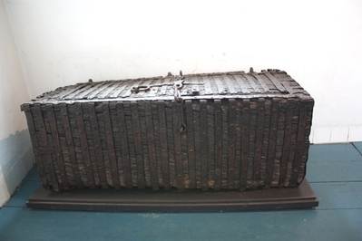 portretschilderij, tafeltje met gekrulde poten en groen tafelkleed met gele kwastjes waarop kandelaar, zandloper en schedel, boek linksonder waarop '1853 1897 I M H v', naast tafeltje met blauw kleed waarop vaas met zakdoek, geheel achter opgetrokken grijze gordijnen